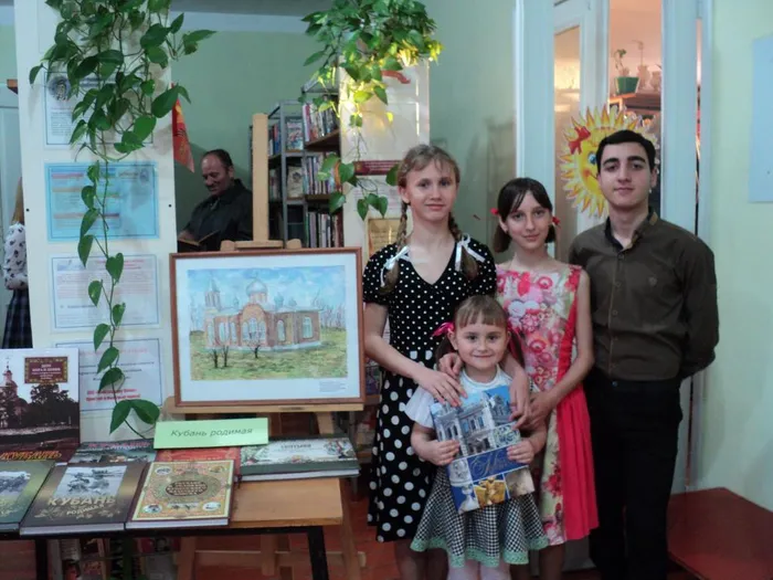 В фойе библиотеки гостей встречала весёлая, задорная казачка и приглашала познакомиться с художественной выставкой «Мой милый край, Кубань моя».